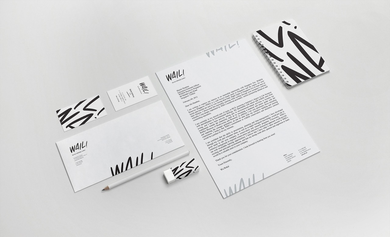 Utilizing a pattern derived from the logo, the stationary of WAIL! was meant to be rebellious, with the graphic elements juxtaposed until the edges of the collaterals.